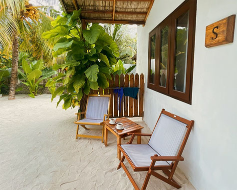 Per la scelta dell'alloggio ho usato Google Maps e Booking. Ho scelto la Guest House The Castaway Retreat anche se non proprio sulla bikini beach perché avevano più anni di esperienza e potevano soddisfare le mie richieste. Con loro ho concordato un pacchetto in mezza pensione, varie escursioni e una cena romantica. La colazione e la cena vengono servite nel giardino interno adornato di piante e alberi, con i piedi sulla sabbia. Il cibo è semplice ma genuino e buonissimo. Non perderti i dolci al cucchiaio Pirini e Custard, li abbiamo graditi particolarmente. I fratelli proprietari della Guest House The Castaway Retreat, subito sono stati molto disponibili. Sono riusciti anche a soddisfare la nostra richiesta di un servizio foto e video con drone. Una volta sull’isola, un po' causa il vento, un po' il mood molto rilassato dei maldiviani, abbiamo dovuto insistere e sollecitare varie volte le attività concordate. Alla fine siamo riusciti ad avere quello che volevamo. I teli mare sono inclusi e vi verranno dati dalla guest house, l’attrezzatura per lo snorkeling è a noleggio.